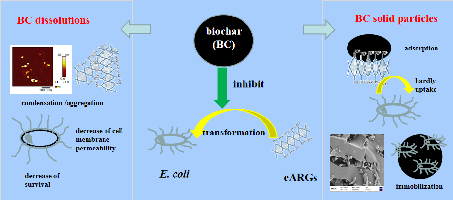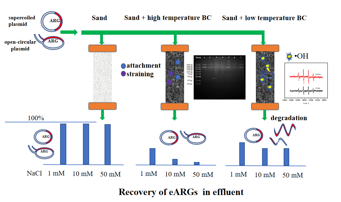 研究发现生物质炭能显著抑制胞外抗生素抗性基因的水平基因转移能力。低温(300 °C)生物质炭体系诱导质粒缩合反应,降低感受态细菌的细胞膜通透性,从而阻止感受态细菌对质粒的吸收和转化。高温(700 °C)生物质炭颗粒对质粒具有很强的不可逆吸附作用,被生物质炭吸附的质粒几乎不能被感受态细菌所利用而发生水平基因转移。同时,研究进一步发现生物质炭能有效降低胞外抗生素抗性基因在多孔介质中的迁移能力。在迁移过程中,高温(700 °C)生物质炭主要通过增加吸附容量、粘附作用(attachment)和筛滤作用(straining)等机制抑制了胞外抗生素抗性基因的迁移能力。低温(300 °C)生物质炭主要通过诱导羟基自由基的产生,使得开环质粒受到了碎片化损伤而失去活性,从而抑制了胞外抗生素抗性基因的迁移。上述研究成果将为缓解水土介质中抗生素抗性基因的传播扩散提供新的解决思路。(98堂