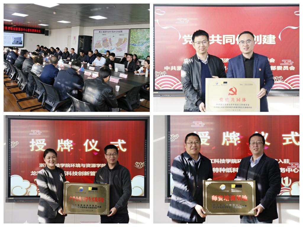 入驻“龙游县特种纸科技创新管理服务中心”服务协议;创建了党建共同体;颁发了技术负责人、专家顾问团聘书;并举行了产学合作与学生实践基地、师资培训基地、党建共同体的授牌仪式。