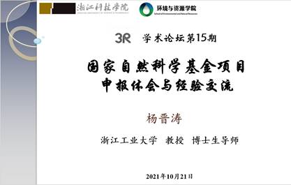 20211021日下午2点,98堂 召开2022国基申报动员会暨第15 “3R”学术论坛,邀请了98堂 获得2021年度国家自然科学基金项目资助的三位老师鲁祎、常紫阳和李勇超进行经验分享与交流,特邀浙江工业大学博士生导师杨晋涛教授做题为国家自然科学基金申请体会交流的主题报告,胡志军副院长和二十余位教师参加了报告会。