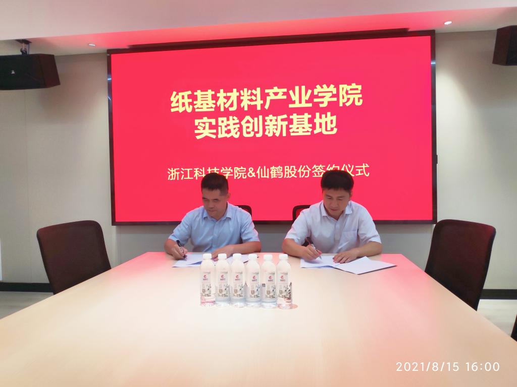 签约暨实践创新基地揭牌仪式在仙鹤股份高性能纸及纤维复合材料——浙江省产业创新服务综合体举行。仙鹤股份总经理助理张诚,总经办主任骆华英,夏王纸业副总经理骆志荣,总经办主任傅群英,浙江科技98堂