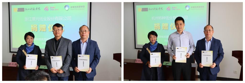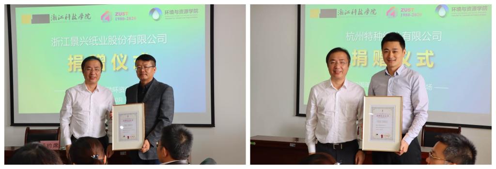 教育基金会捐赠100万元,杭州特种纸业有限公司捐赠100万元。万健向景兴纸业王志明总经理、杭特纸业王建业总经理颁发捐赠证书。