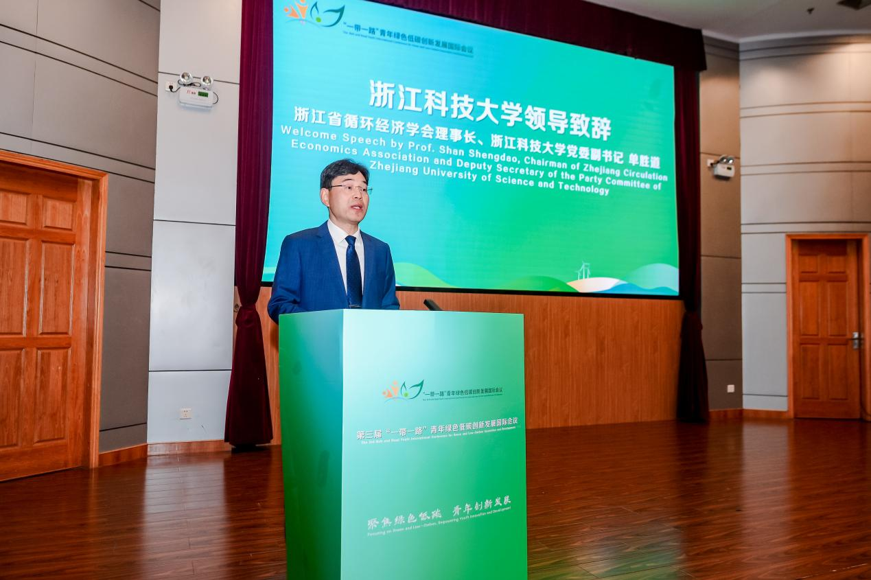 党委副书记、浙江省循环经济学会理事长单胜道代表主办方致欢迎辞。他表示,在全国深入学习贯彻党的二十届四中全会精神的关键时期,本次会议的召开对于实现国家“双碳”目标和推动大学生绿色低碳教育具有重要现实意义与时代价值。本次会议将进一步整合高校、政府、企业资源,为全球青年搭建高水平交流平台,推动青年智慧和低碳科技创新成果更好服务于全球绿色发展。