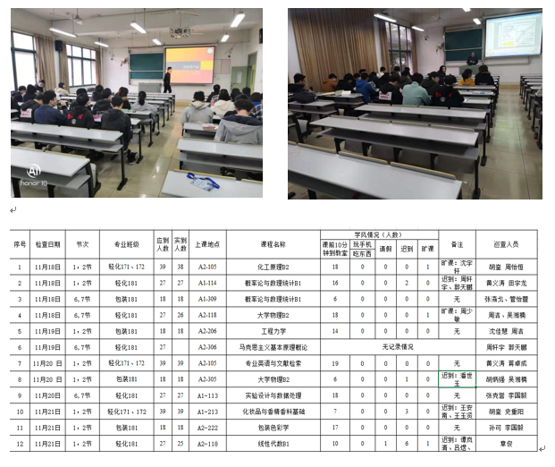 轻化171.172,专业英语与文献检索,赵会芳老师,应到39人,7:50分到教室19人,7:55分到22人,8:00到39人,教师备课充分,课堂氛围较好,部分同学积极性有待提高。
